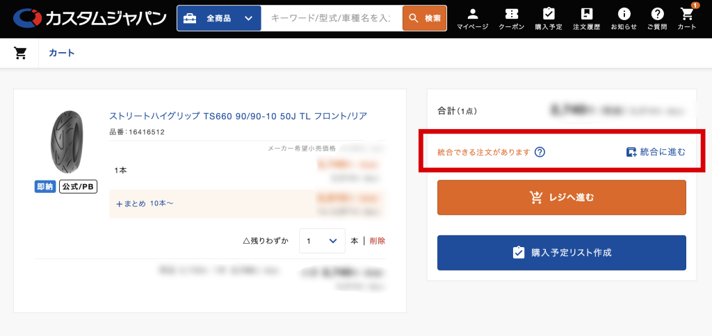追加したい商品をカートに投入後、カート画面で「統合に進む」ボタンをクリックしてください。