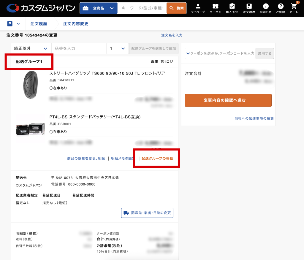 「変更内容の確認へ進む」をクリックすると、配送グループの移動が完了します。まとめられた「配送グループ」が表示されるので、内容を確認してください。この画面で、送料無料やクーポンが適用されているかもご確認ください。