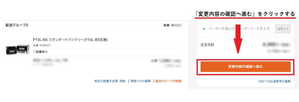 「変更内容の確認へ進む」をクリックすると、配送グループの移動が完了します。まとめられた「配送グループ」が表示されるので、内容を確認してください。この画面で、送料無料やクーポンが適用されているかもご確認ください。