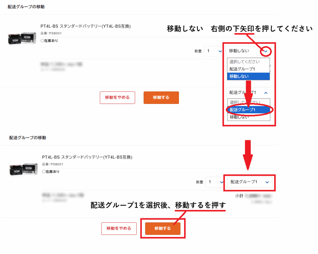 ※注意※ 統合した注文に「同じ倉庫の配送グループ」があると送料がかかる場合があります。「配送グループの移動」をクリックし、同じ倉庫の配送グループを選択してください。