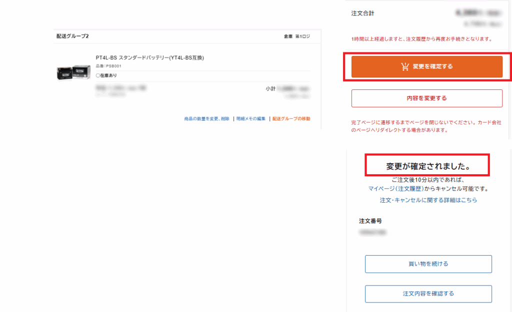 「変更を確定する」をクリックすると、「変更が確定されました。」と表示され、注文番号が発行されます。