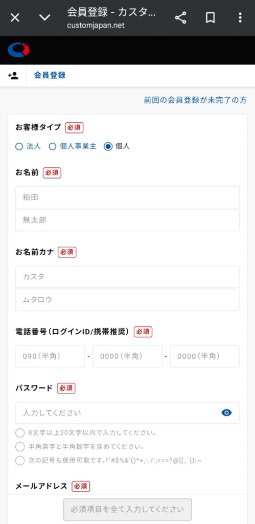 サイトにアクセスし、写真の赤丸「会員登録」をタップして、「〇法人、〇個人事業主、〇個人」の中から「〇個人」を選択。必要事項を記入すれば、数分で登録は完了します。