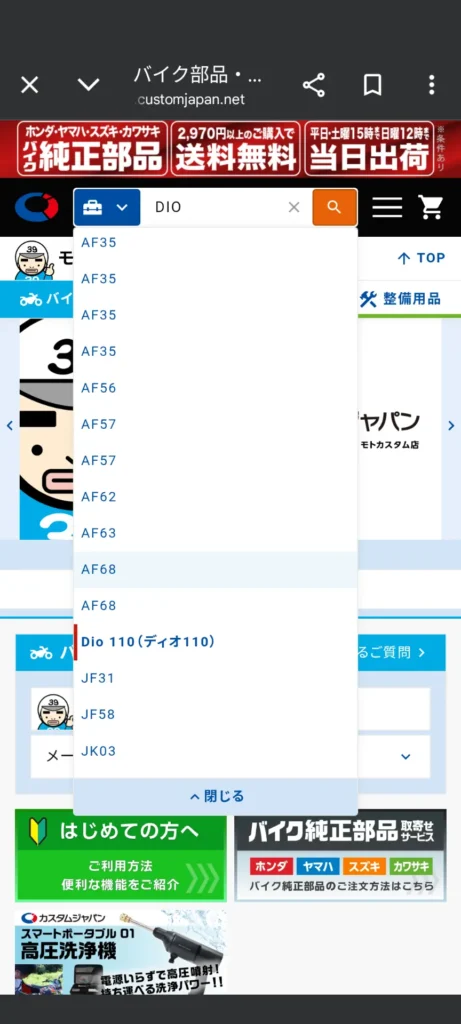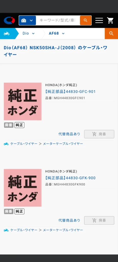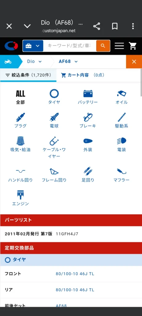 検索欄に車種名を入力しただけで年式ごとの形式番号が表示され、そこからさらにパーツのカテゴリ別に絞り込むことができ、自分のバイクに装着できる部品が品番レベルで表示されます。