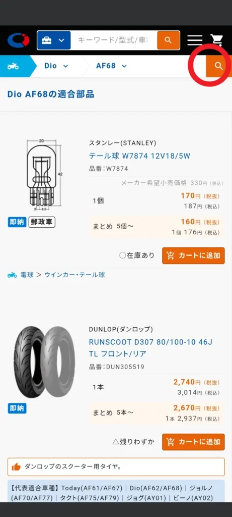 ログイン後に車種名を入力し、年式ごとの形式番号を選択します。さらに赤丸の「🔍」マークをタップ。