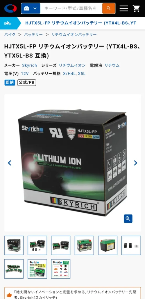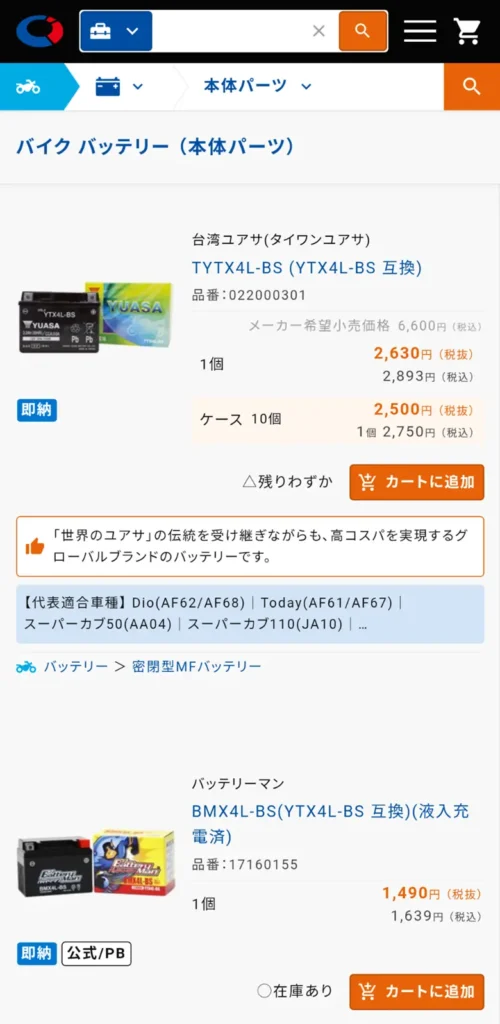 特にバッテリーは、主流のMFバッテリーはもちろん従来の液別バッテリー、最新のリチウムイオンバッテリーまで豊富に揃っています。車両を登録して検索することで、対応する商品を簡単に見つけることができます。