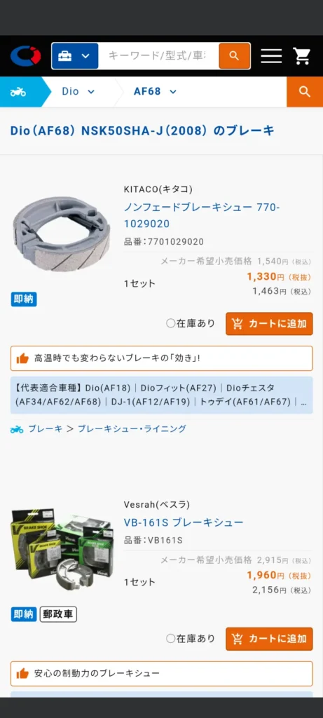 純正パーツはもちろん、国内の一流パーツメーカーによる適合パーツまで、幅広い選択肢を一瞬で表示。予算や目的に合わせたパーツ選びが簡単にできます。