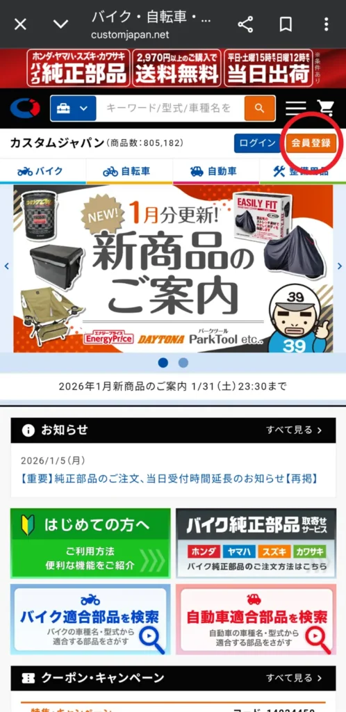 これまでカスタムジャパンは「バイク業界の卸業者」というイメージが強く、「業者専用で個人では登録できない」と思われていたかもしれません。上の画像はカスタムジャパンの業販用仕入れカタログです。あくまでバイクショップやバイク用品店が商品の仕入れの際に活用するもので、一般ユーザー向けではありません。カスタムジャパンをご存じの方も、このイメージが強いのではないでしょうか。しかし、実際のところは個人のお客様でも会員登録は可能なのですが、その事実は広く知られていませんでした。