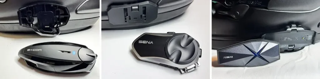 B+COM ONEとSENA J30はベースプレートへのマウントはツメでしっかりとハメるシステム。さっと取ることはできないが、比較的楽に取り外せる。