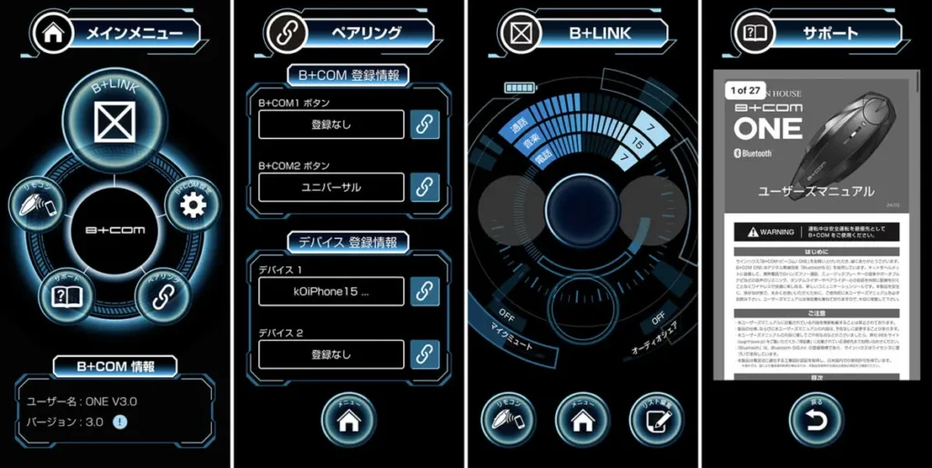 B+COMの専用アプリでは、ユーザーマニアルで使い方も安心/可視化できるペアリング状態/好みの音量やオーディオシェアのオンオフなど、出発時のペアリングのイライラ知らず。