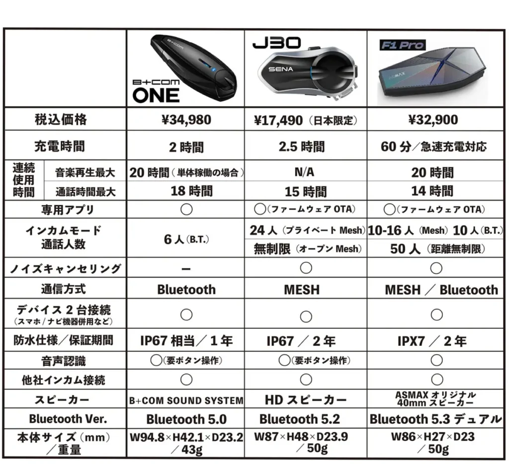 バイク用インカムスペック比較早見表:B+COM ONE/SENA J30/ASMAX F1Pro