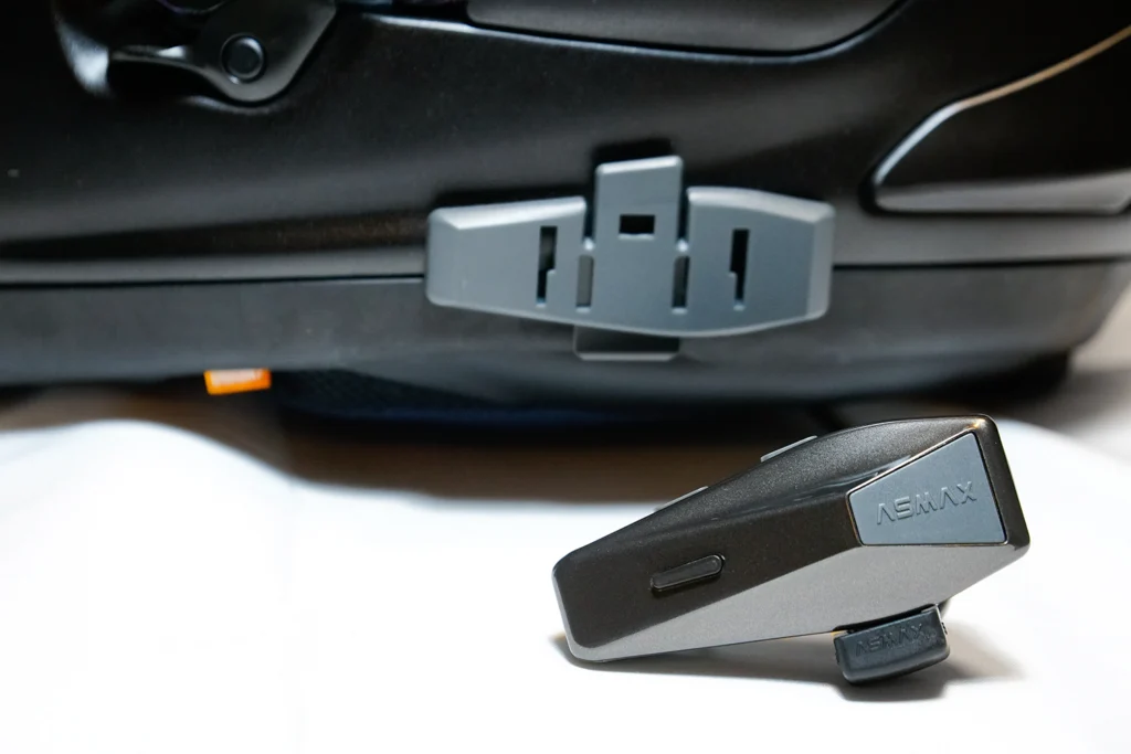 ヘルメットへの取り付けにはバッククリップ式を採用しており、本体背部にあるツメをベースのくぼみにハメてカチッと固定するだけで手軽に装着できます。もちろん取り外しも簡単で、上のつまみを押して上に引き抜くだけです。