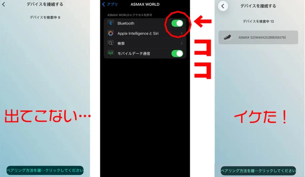 そんな時はiPhoneの「設定」から「アプリ」に行き、「ASMAX World」を選んだら「Bluetooth」をオンにしてください。これで問題なく接続できるようになります。