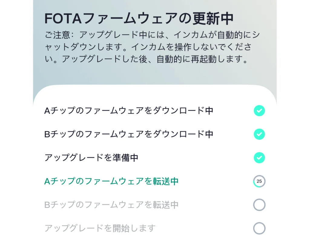 デバイスをWi-Fiで繋いだりPCを使用、など面倒な操作は一切なく、アプリを開けば最新ファームアップがある場合でもすぐに分かります。