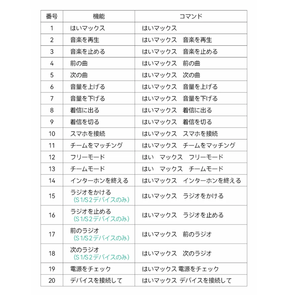 S2では本体のボタン操作だけでなく音声コマンドでの操作に対応しており、ウェイクアップワード(音声認識キーワード)の「ハイ、マックス!」でスマホの音声アシスタントが使えるだけでなく、走行中でも音楽再生・音量調整・チーム作成/通話応答ほかハンズフリーで操作可能です。