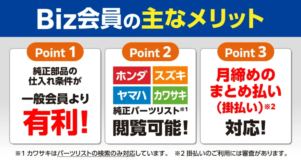 Biz会員では、純正部品の価格条件、純正パーツリスト閲覧、まとめ払い(掛け払い)など、事業者様向けの機能をご利用いただけます。