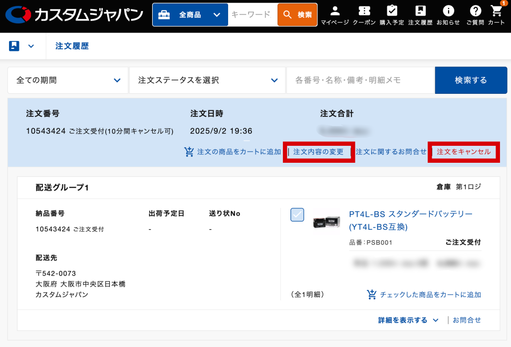 ご注文後10分以内の「注文キャンセル」ボタンが表示されている間はキャンセルが可能です。
