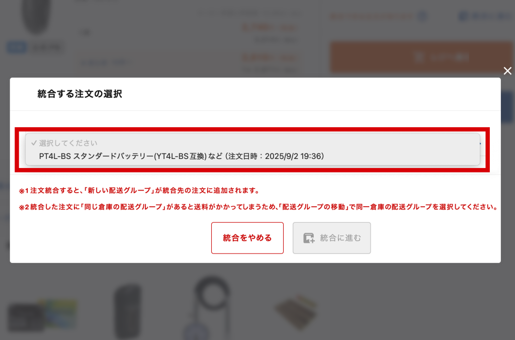 カートページに「統合へ進む」と表示された場合は、追加注文を統合することが可能です。
